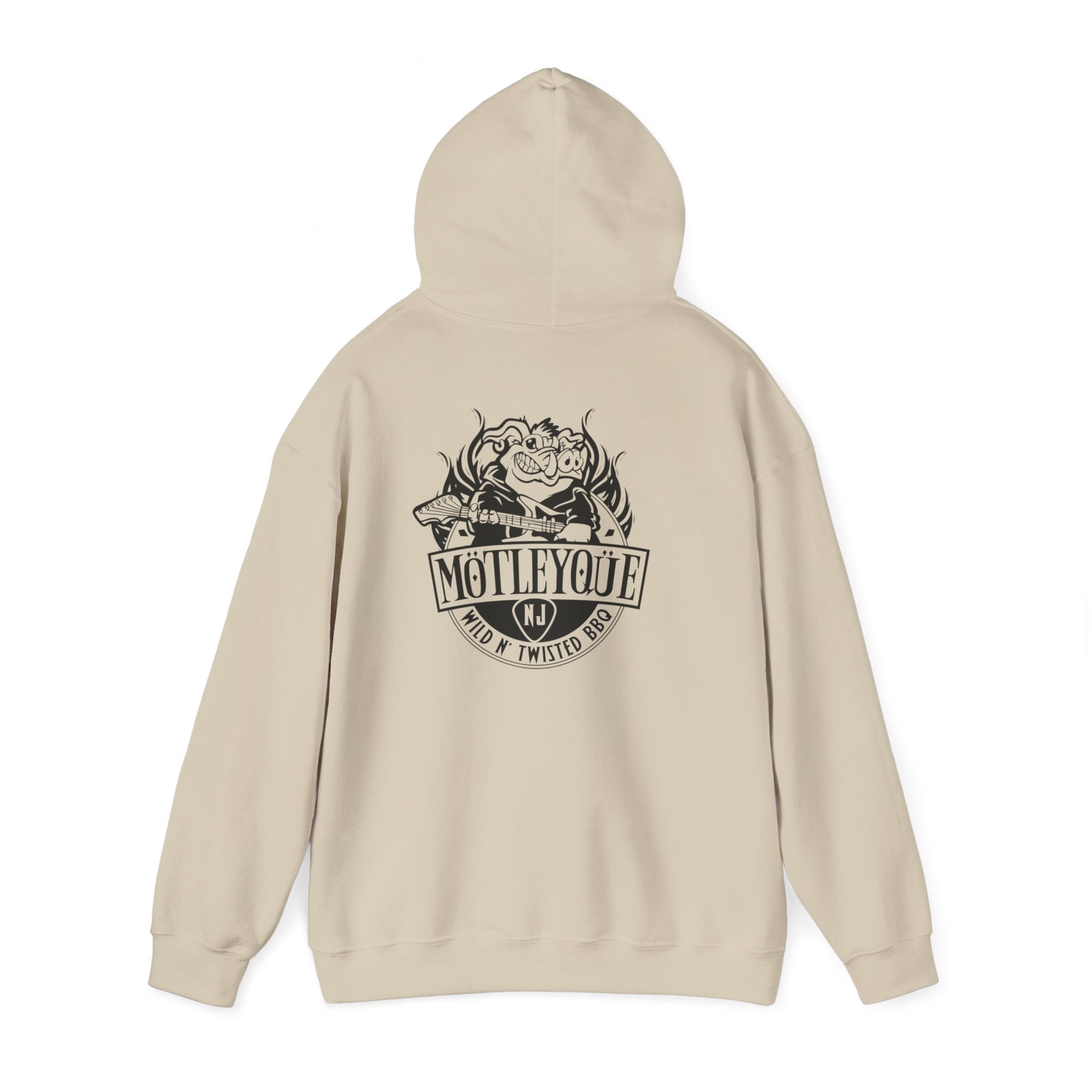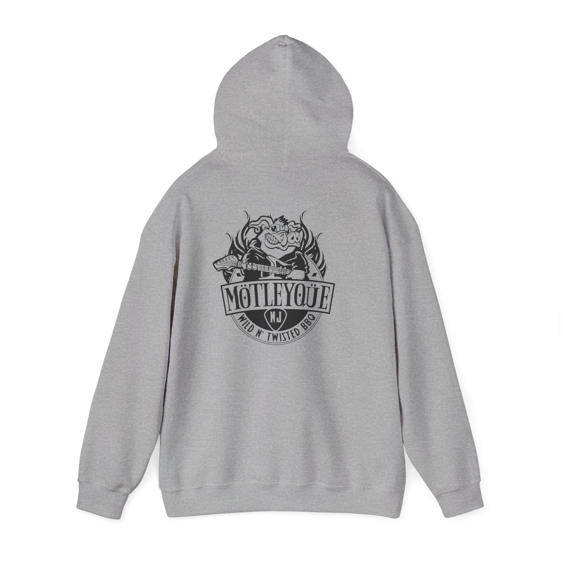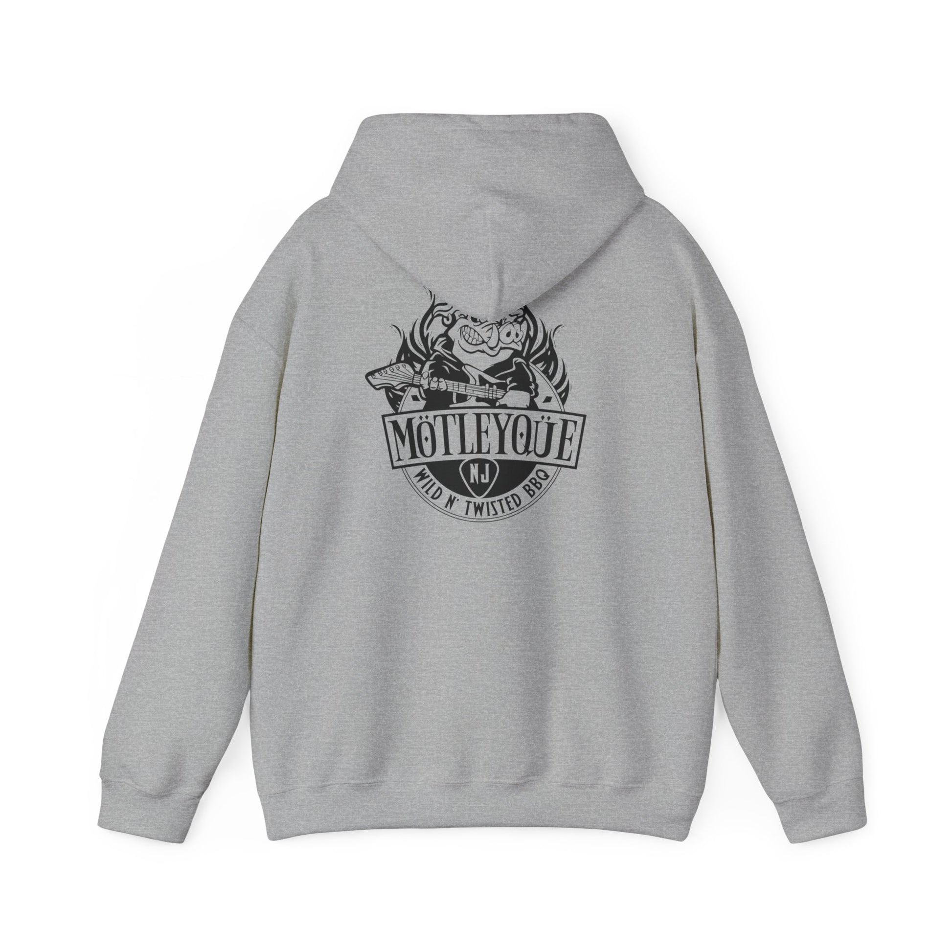 This soft, mid-weight hoodie carries a hand-drawn, vintage-inspired emblem that feels equal parts road‑worn band patch and tattoo flash. The monochrome crest — snarling floral skulls, banner typography, and a small circular insignia — sits centered on both front and back, giving the hoodie an intentional, lived-in look that layers easily under jackets or stands alone on cool evenings. Wear it to late-night shows, roadside diners, or while sketching in a dim café; its roomy pouch pocket and double-lined hood keep you warm while the tear‑away label keeps irritation out of the way. The fabric has enough body to hold the print crisply while staying soft against skin, so the design ages with you instead of against you.