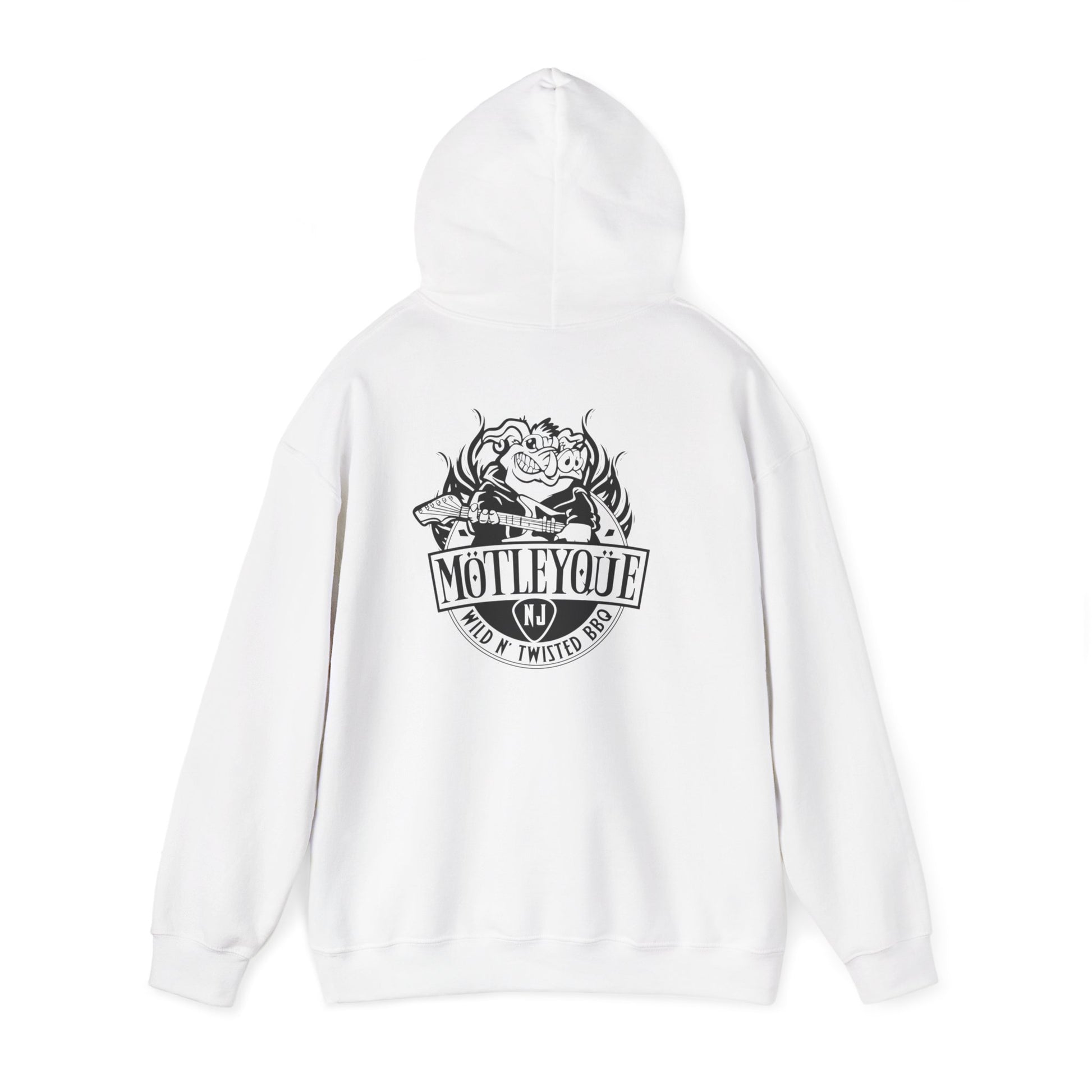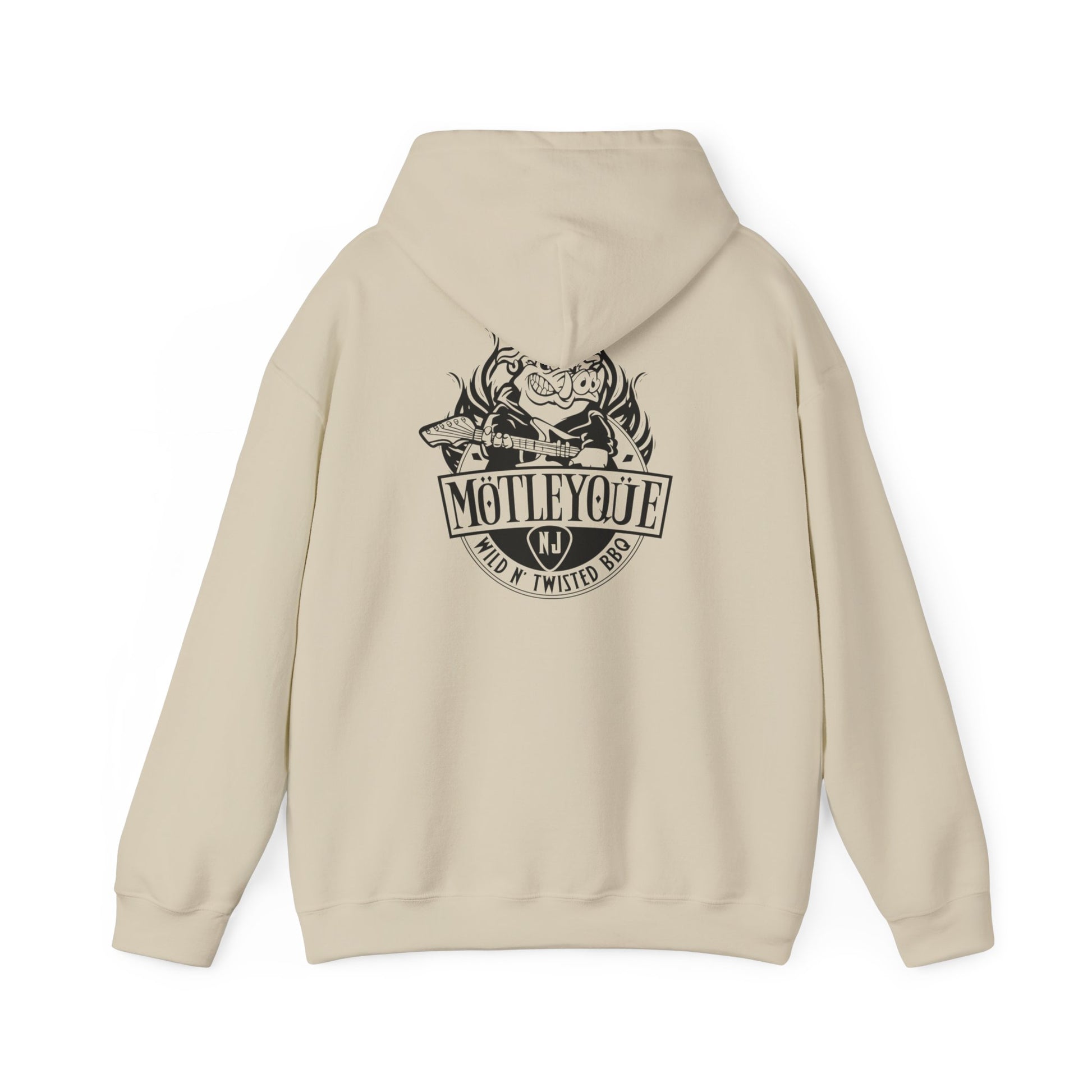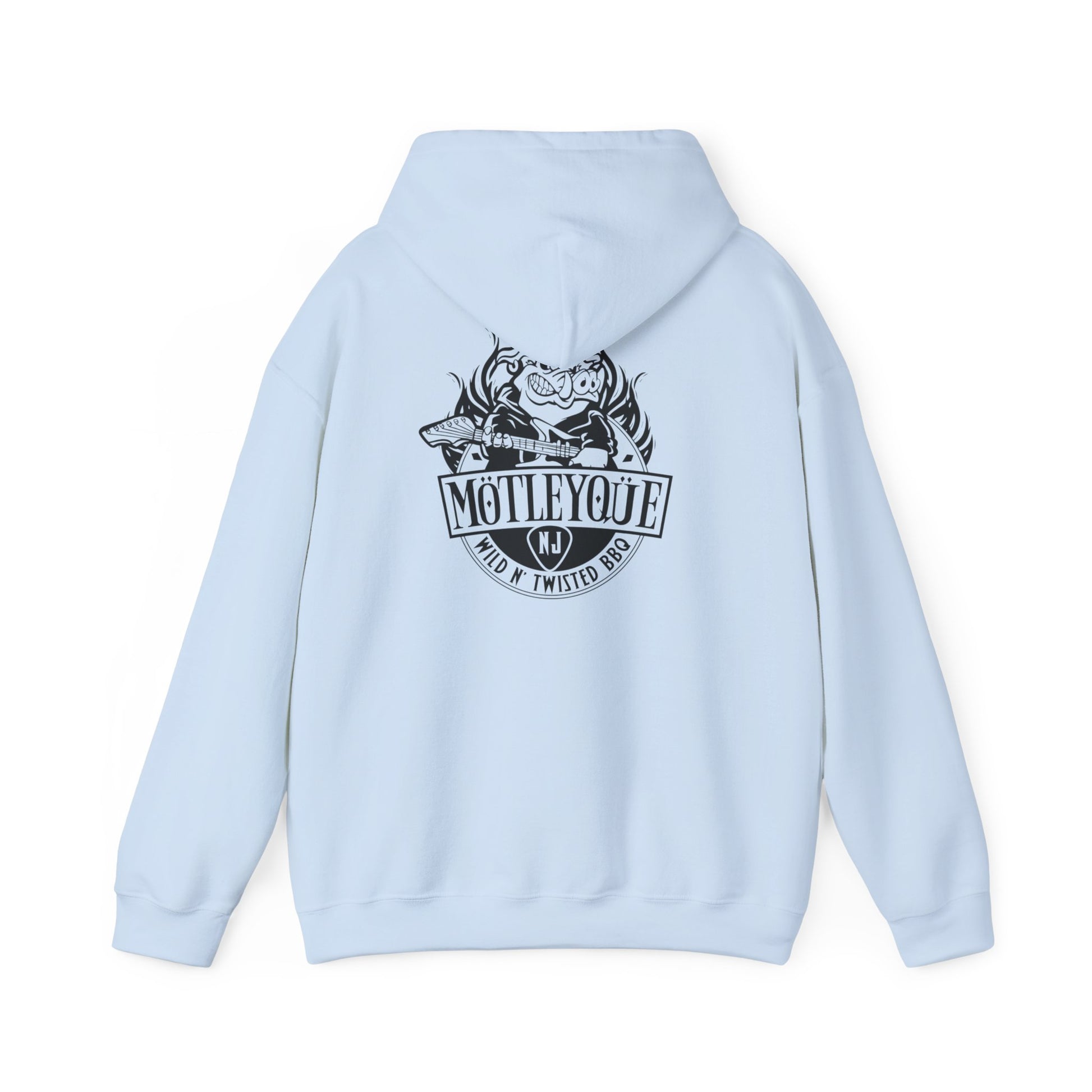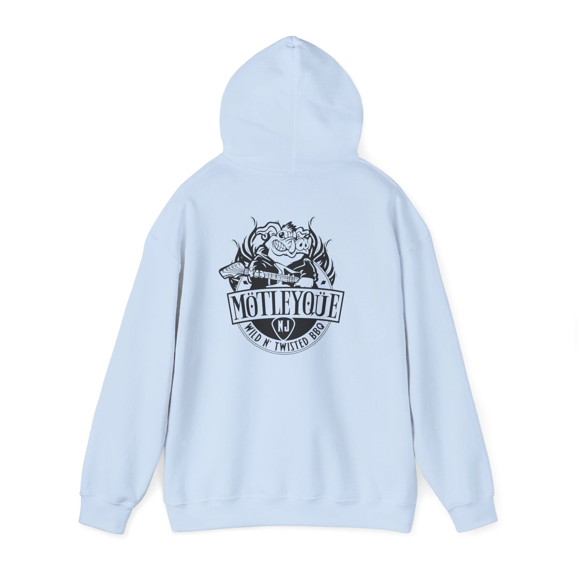 This soft, mid-weight hoodie carries a hand-drawn, vintage-inspired emblem that feels equal parts road‑worn band patch and tattoo flash. The monochrome crest — snarling floral skulls, banner typography, and a small circular insignia — sits centered on both front and back, giving the hoodie an intentional, lived-in look that layers easily under jackets or stands alone on cool evenings. Wear it to late-night shows, roadside diners, or while sketching in a dim café; its roomy pouch pocket and double-lined hood keep you warm while the tear‑away label keeps irritation out of the way. The fabric has enough body to hold the print crisply while staying soft against skin, so the design ages with you instead of against you.